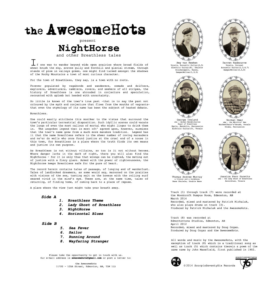 With a musical tea steeped in nostalgia, sweetened with a songbird voice, roughed up with a squeeze of country twang and bolstered by a jigger of Canadian whiskey, the AwesomeHots serve up a hot toddy of irreverent parlour folk.